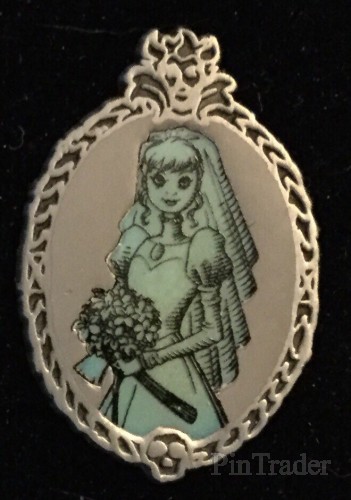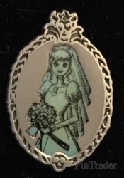 | The pin features the stretching portrait room's Bride Ghost Constance, the widow that sits on a tombstone headstone. She is in within a silver sculpted metal oval mirror frame. The character features glow in the dark paint fill! Released at both WDW and DLR. Two pins per box |