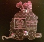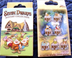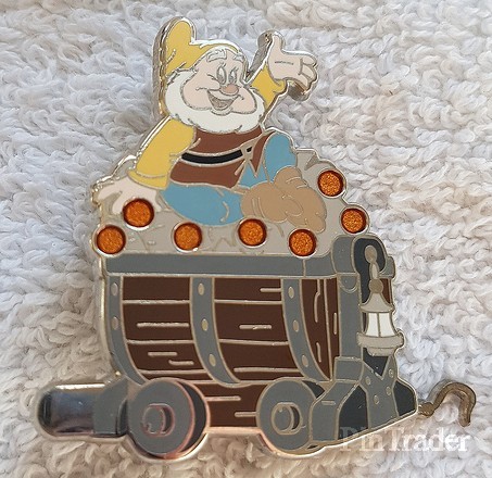 | This pin comes from a set of 7 pins in a mystery collection. It shows the dwarf Happy on a mine car full of orange jewels. On the bottom right there is a hook which attaches onto the other mine cars in the collection, while on the bottom left there is a hinge for the other cars to attach to. |
