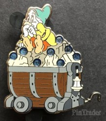 | This pin comes from a set of 7 pins in a mystery collection. It shows the dwarf Bashful on a mine car full of teal jewels. On the bottom right there is a hook which attaches onto the other mine cars in the collection. |