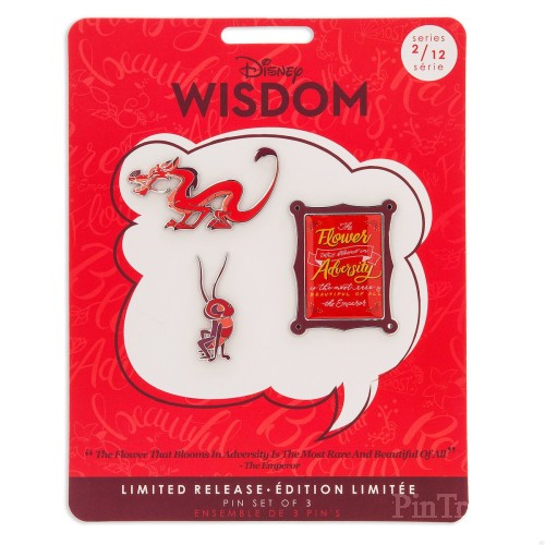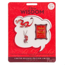 | Description from Shop Disney: Item No. 6505057584580P Mushu and his sidekick Cri-Kee are included in this limited release Mulan pin set that includes an inspirational quote from the Emperor. Celebrate the timeless wisdom found in Disney films with this offering from our Disney Wisdom Collection. Magic in the details • Please Note: Purchase of this item is limited to 1 per Household. • Limited release • Set includes three enamel cloisonne pins • One pin features Mushu, one features Cri-Kee, and one features the Emperor's quote ''The flower that blooms in adversity is the most rare and beautiful of all!'' • Gleaming silvertone finish • Mickey icon pinbacks • ''Disney Pin Trading 2019'' and ''Disney Wisdom'' logo on back • Comes on commemorative card • Second in a series of 12 monthly collectible pin sets • Inspired by Disney's Mulan (1998) • Part of the Disney Wisdom Collection The bare necessities • Metal / enamel • Mushu: 2'' L • Cri-Kee: 1 1/2'' H • Quote: 2'' H • Imported |