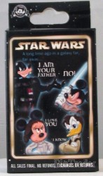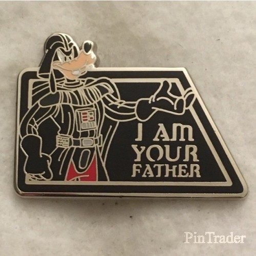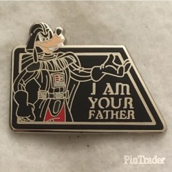 | This open edition mystery box features Disney Characters as Star Wars characters with quotes from the movie. This is a listing for Goofy as Darth Vader - "I am your father" This pin is shaped so that it fits with the pin featuring Mickey Mouse as Luke Skywalker saying "No!" Two pins per box |