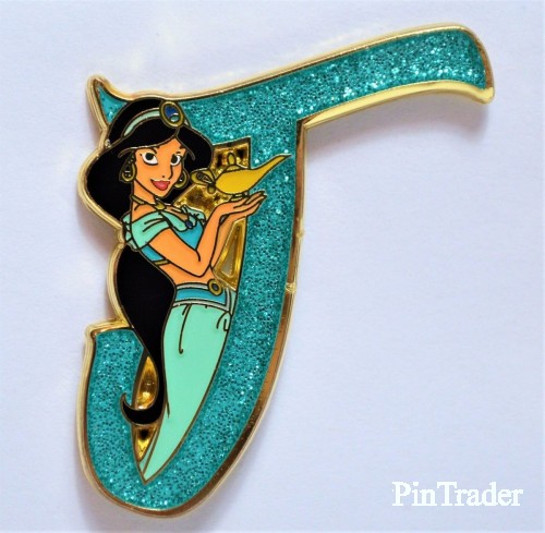 | The letter "J" is teal and glittery. Jasmine is holding the magic lamp in her hands. Two pins per box |