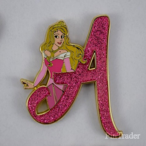 | The letter "A" is pink and glittery. Aurora is posed in her pink dress. Two pins per box |