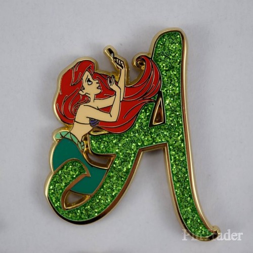| The letter "A" is green and glittery. Ariel is a mermaid. Ariel is looking up at her dinglehopper (fork). Two pins per box |