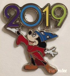 | Mickey's hand is holding the "2" in the "2019." Two pins per box |