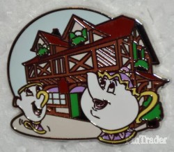| This listing is for Mrs. Potts and Chip pin from the limited release New Fantasyland - Beauty and the Beast mystery collection. This pin features Mrs. Potts and Chip with a house from Belle's town behind them Two pins per box. The pin is silver metal. One pin post with nubs. Mickey head icon pattern. Back has: Authentic Official Disney Parks 2012 logo © DISNEY MADE IN CHINA |
