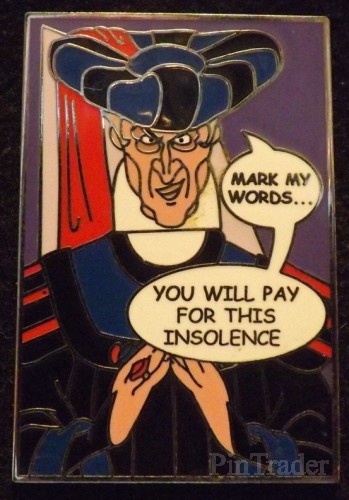 | A Set of 10 mystery pins featuring famous Disney Villains in Comic Strip form along with a quote. This pin features Frollo (The Hunchback of Notre Dame) saying Mark My Words ... You Will Pay For This Insolence. Two pins per box. |