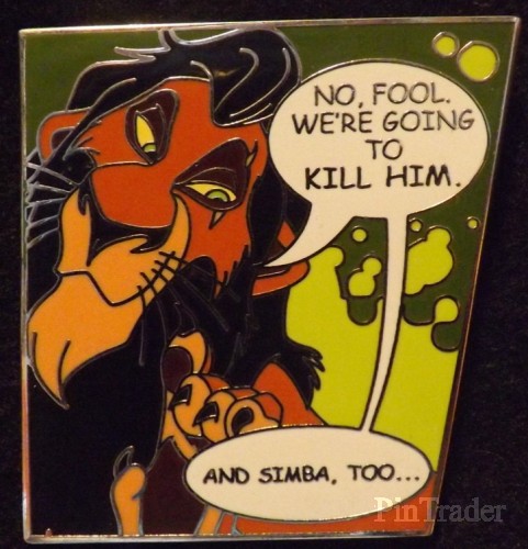 | A Set of 10 mystery pins featuring famous Disney Villains in Comic Strip form along with a quote. This pin features Scar (The Lion King) saying No , Fool We're Going To Kill Him ... And Simba Too... Two pins per box. |