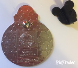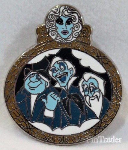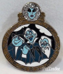 | Three blue/teal/turquoise hitchhiking ghosts are in the center of the pin and Madame Leota is in her crystal ball at the top. The entire pin is outlined in a decorative brown design. Two pins per box. |