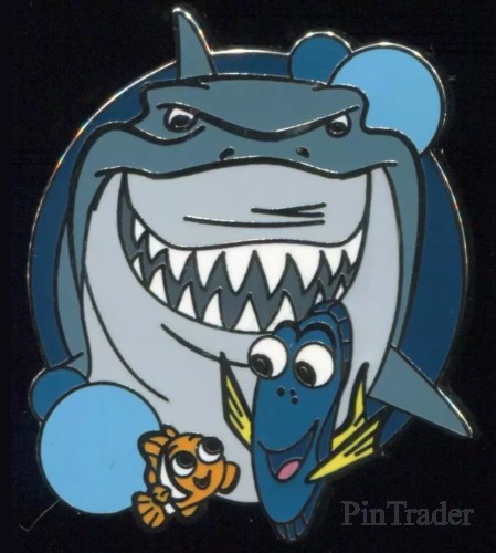 | Nemo, Dory, and Bruce from The Seas with Nemo and Friends in front of a blue background with light blue bubbles. Two pins per box. |