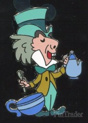 | This is the Mad Hatter from the Alice in Wonderland mystery set, based on Mary Blair's concept art. He wears his usual suit, with mustard yellow coat and green top hat. He is facing right, with a blue teapot in one hand and a spoon in the other. A blue striped sugar bowl rests at his feet. Two pins per box. |