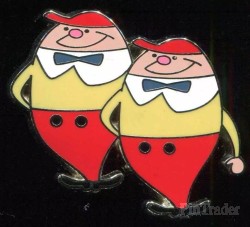 | This is Tweedledum & Tweedledee from the Alice in Wonderland mystery set, based on Mary Blair's concept art. They are dressed alike in red caps, red pants, and yellow shirts with white collars and blue bow ties. They face slightly left with their hands behind their backs. Two pins per box. |