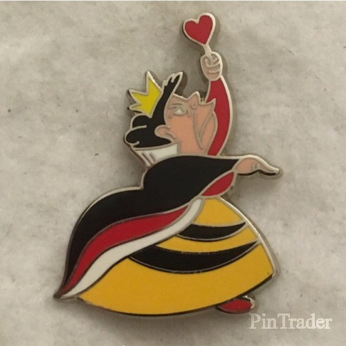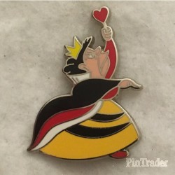 | This is the Queen of Hearts from the Alice in Wonderland mystery set, based on Mary Blair's concept art. She wears her traditional black and red dress with black and yellow underskirt. She faces right, holding her heart scepter in one hand and pointing ahead of her with the other hand. Two pins per box. |