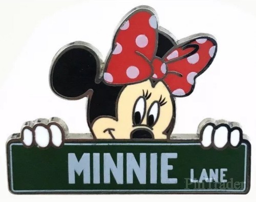 | Minnie Mouse is looking over the top of a street sign stating Minnie Lane. This pin is one of eight in the Street Signs Mystery Box set. Each box contains two randomly selected pins. |