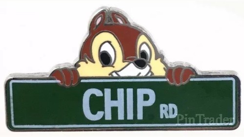 | Chip is looking over the top of a street sign stating Chip Road. This pin is one of eight in the Street Signs Mystery Box set. Each box contains two randomly selected pins. |