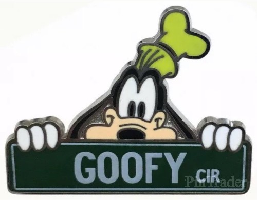 | Goofy is looking over the top of a street sign stating Goofy Circle. This pin is one of eight in the Street Signs Mystery Box set. Each box contains two randomly selected pins. |