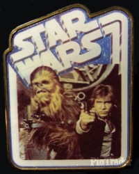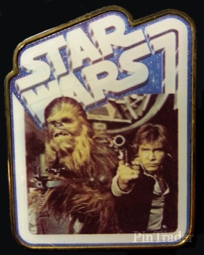 | Pin features photo of Han Solo pointing a blaster and Chewbacca (Chewie) pointing a compound bow. The Star Wars logo is above them and white lines run around the pin. Description from Disneystore.com/shopDisney.com Each box contains two randomly selected pins* The collection contains nine pins. Enameled cloisonne Golden finish The bare necessities Metal / enamel Imported |
