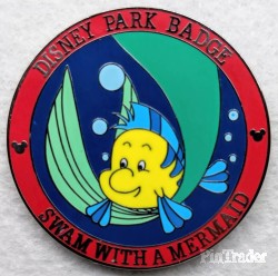| Receive a "park badge" for completing various activities within the park. Flounder is shown with Ariel's tail (The Little Mermaid) on this round pin which says "Disney Park Badge" on the top and "Swam With A Mermaid" on the bottom. Two pins per box. |