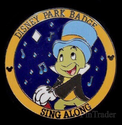 | Receive a "park badge" for completing various activities within the park. Jiminy Cricket is featured on this round (circular) pin which says "Disney Park Badge" on the top and "Sing Along" on the bottom. Two pins per box. |