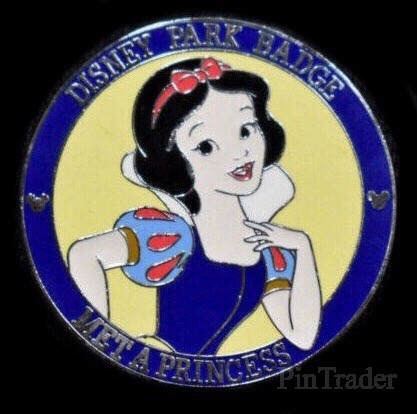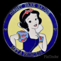 | Receive a "park badge" for completing various activities within the park. Snow White is shown on this round pin which says "Disney Park Badge" on the top and "Met a Princess" on the bottom. Two pins per box. |
