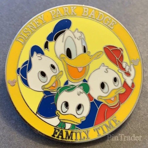 | Receive a "park badge" for completing various activities within the park. Donald Duck, Huey, Dewey and Louie (three nephews of Donald Duck and Scrooge McDuck) are shown on this round pin which says "Disney Park Badge" on the top and "Family Time" on the bottom. Two pins per box. |