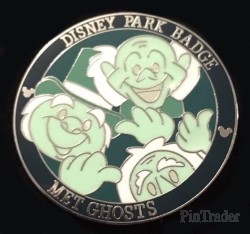 | Receive a "park badge" for completing various activities within the park. The three hitchhiking ghosts - Ezra, Phineas, and Gus - are featured on this round pin that says "Disney Park Badge" on the top and "Met Ghosts" on the bottom. Two pins per box. |