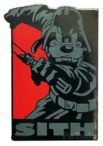 | 1 of 7 pins from a booster set where classic characters are dressed as Star Wars characters . This pin features Goofy dressed as Darth Vader and the word Sith |