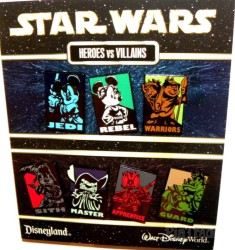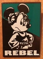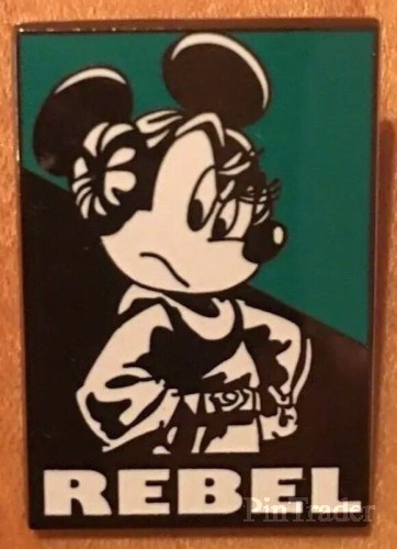 | 1 of 7 pins from a booster set where classic characters are dressed as Star Wars characters . This pin features Minnie Mouse dressed as Princess Leia and the word Rebel |