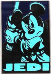 | 1 of 7 pins from a booster set where classic characters are dressed as Star Wars characters . This pin features Mickey Mouse dressed as Luke Skywalker and the word Jedi |