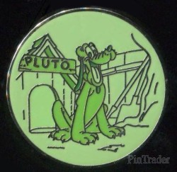 | Pluto outside of his doghouse on a round pin with a green background . Each mystery pouch has one (1) pin inside and the retail price is $4.99 per pack. This pin set features characters in costume, there are six in total |