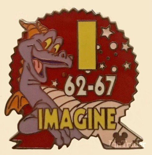 | This pin features the parking lot signs at Epcot that feature Figment. This is I 62 - 67 Imagine with a red spaceship earth as the background |