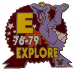 | This pin features the parking lot signs at Epcot that feature Figment. This is E 76 - 79 Explore with a red spaceship earth as the background |
