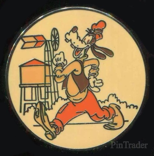 | Goofy on a round pin with a orange background . Each mystery pouch has one (1) pin inside and the retail price is $4.99 per pack. This pin set features characters in costume, there are six in total |