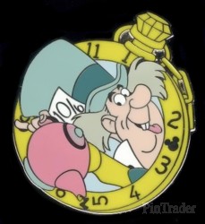 | The Mad Hatter from Alice in Wonderland is pictured in the middle of a pocket watch. He is holding a teapot. |