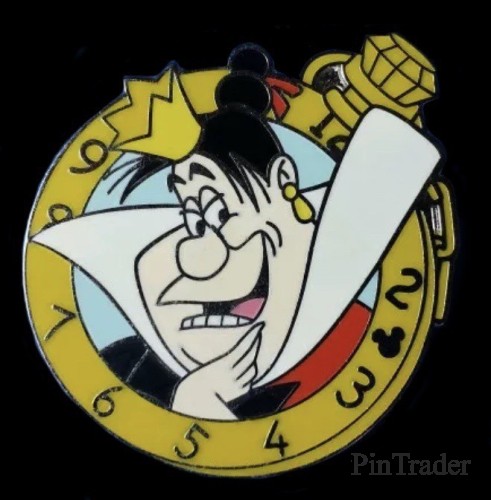 | The Queen of Hearts from Alice in Wonderland is pictured in the middle of a yellow pocket watch. One of her hands is on her chin. |