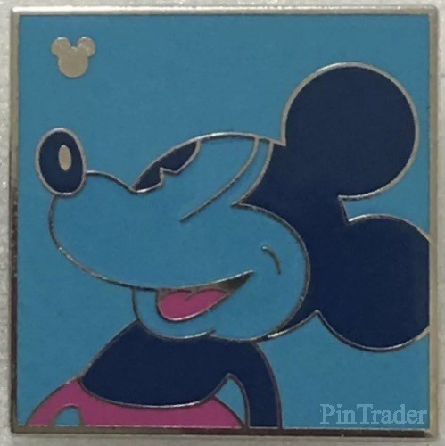 | This pin features Mickey Mouse in blue on a square neon blue background |