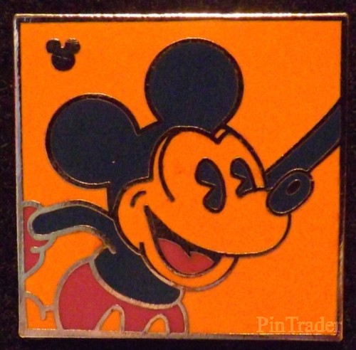 | This pin features Mickey Mouse in orange on a square neon orange background |