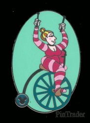 | This pin features a female cyclist riding a penny farthing bicycle. |