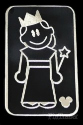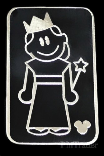 | This pin features an outline of a young female dressed as Fairy or Princess on a black background wearing a crown. This back says that this is the completer pin for this set. |