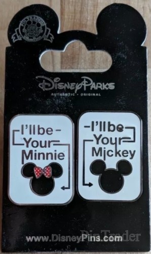 | This open edition pin is a set of 2 pins. The words "I'll be Your Mickey" appear on one pin and the words "I'll be Your Minnie" appear on the second. There are arrows pointing to a Mickey and a Minnie head. |