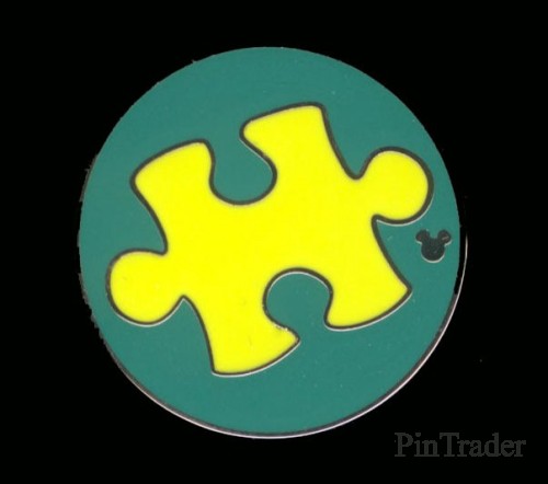 | This pin is meant to resemble one of the badges available at the Redwood Creek Challenge Trail. This pin resembles one of badges that Russell, from the movie Up, wears. This pin is a circle with a puzzle piece in the middle. A silver hidden mickey icon is located on the pin. |