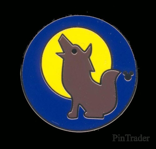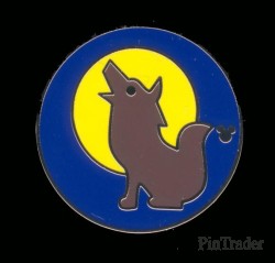 | This pin is meant to resemble one of the badges available at the Redwood Creek Challenge Trail. This pin resembles one of badges that Russell, from the movie Up, wears. This pin is a blue circle with a brown wolf howling at a yellow moon in the middle. A silver hidden mickey icon is located on the pin. |