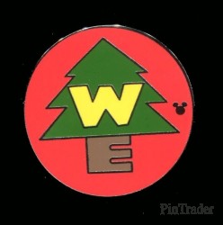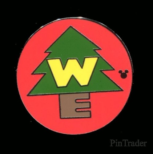 | This pin is meant to resemble one of the badges available at the Redwood Creek Challenge Trail. The pin features a W.E. badge from the Redwood Creek Challenge Trail. This pin resembles one of badges that Russell, from the movie Up, wears. This pin is a red circle with a green tree that has a brown trunk. A yellow "W" is on the tree and the trunk creates a "E". A silver hidden mickey icon is located on the pin. This completer was available as PWP for every $30 spent. |