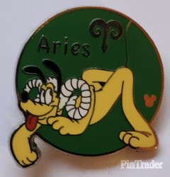 | This Hidden Mickey 2012 pin features Pluto, Mickey's faithful companion, as the Zodiac sign Aries the Ram. Pluto is wearing ram horns above his ears. The back of the pin says "Hidden Mickey Pin 1 of 12." A shared release between Disneyland Resort (DLR) and Walt Disney World (WDW). Hidden Mickey Zodiac Collection 2012, features the 12 zodiac signs. |