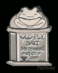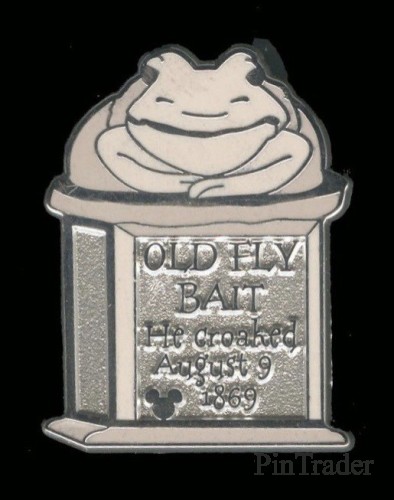 | This pin features a tombstone from the Haunted Mansion attraction. This one says: Old Fly Bait He Croaked August 9, 1869. It features a frog on top of the tombstone. |