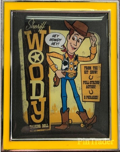 | Two pins per box. “Sheriff Woody Talking Doll” “Hey howdy hey” “From the hit show” “Pull string action” “8 phrases” |