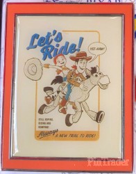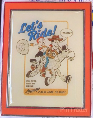 | Two pins per box. Let's Ride poster features Woody the cowboy, Jessie the cowgirl, and Bullseye the horse. “Still roping, riding and romping!” “Always a new trail to ride” “Yee-Haw!” |