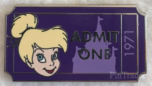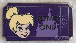 | This pin is part of the Admission Ticket 'pin with purchase' and features Tinker Bell's head and reads "admit one" and has Cinderella's Castle amidst a purple background. The year 1971 appears on the ticket, which is the year Walt Disney World opened. |