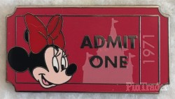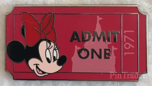 | This pin is part of the Admission Ticket 'pin with purchase' and features Minnie Mouse's head and reads "admit one" and has Cinderella's Castle amidst a pink background. The year 1971 appears on the ticket, which is the year Walt Disney World opened. |