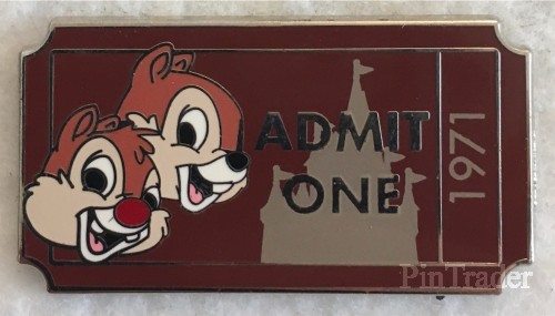 | This pin is part of the Admission Ticket 'pin with purchase' and features Chip and Dale's heads and reads "admit one" and has Cinderella's Castle amidst a brown background. The year 1971 appears on the ticket, which is the year Walt Disney World opened. |